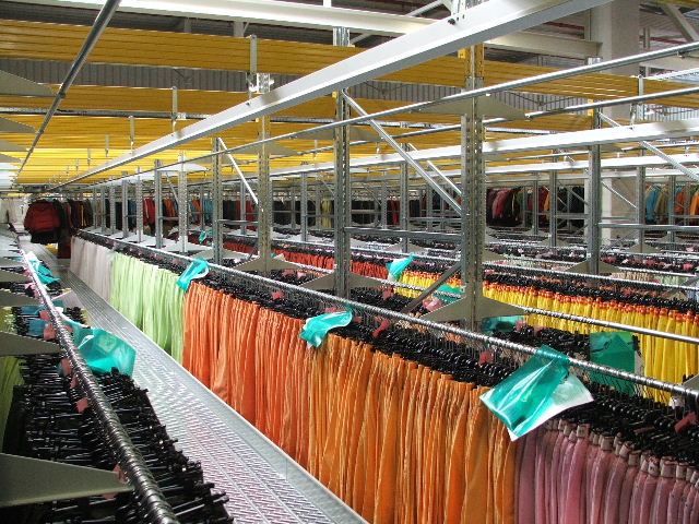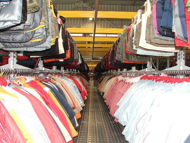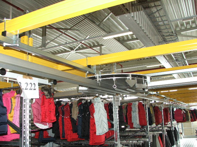 - Bühnen mit 2-geschossiger Hängeregalanlage, z. B. für aufgebügelte Bekleidung