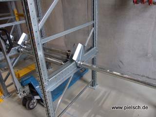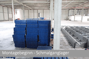 FOTOS: Auf Basis eines Palettenregales von 12,5m Höhe und Fachweiten von 2.540mm für 5 Behälter nebeneinander wurde z.B. nachstehendes AKL von uns konzipiert. Die Fotos entstanden beim Aufbau.
