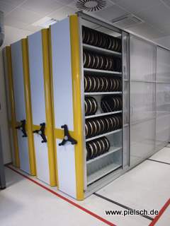 Fachbodenregale auf Fahrwagen - so wird Lagerplatz komprimiert.